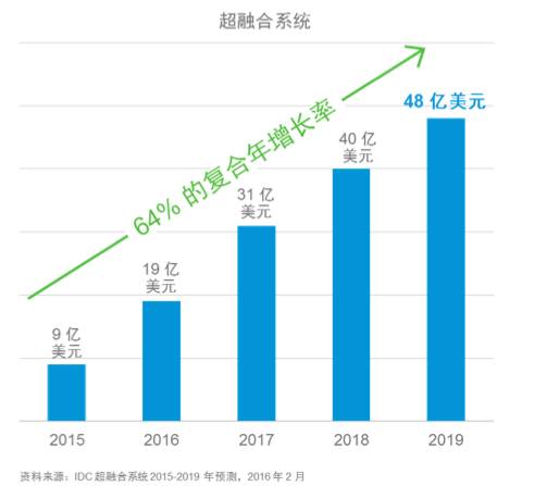 根据IDC数据,全球超融合系统市场预计有60%的年复合增长率,到2019年全球超融合系统市场发展将接近40亿美元。IDC对超融合系统Hyperconverged Systems (HC) 定义在单一解决方案中包含核心存储和计算功能。这些系统可能包含应用装置和软件定义方案。